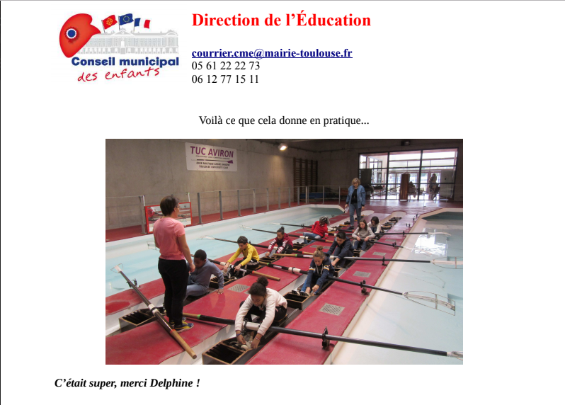 Afin de préparer le projet d'organiser et d'animer une journée sportive au gymnase de Daniel Faucher, le Conseil Municipal des Enfants est venu découvrir l'aviron par le biais du tank à ramer. Ils souhaitaient découvrir cette activité qui fera partie des animations proposées lors du mercredi 17 Avril. Essai concluant avec des enfants enchantés par la découverte du tank à ramer ! |