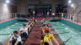 En hiver, lorsque la nuit tombe tôt rendant toute navigation interdite sur la Garonne, ou lorsque les conditions météorologiques sont défavorables, les rameurs ont à leurdisposition un "tank à ramer", sorte de bateau 16 places en dur, bien au sec, dans un bâtiment du TUC. L'entraînement sur l'eau est alors remplacé par une séance au tank : le créneau horaire est divisé en deux, chaque rameur alterne ainsi "bateau" et préparation physique. ![]() |